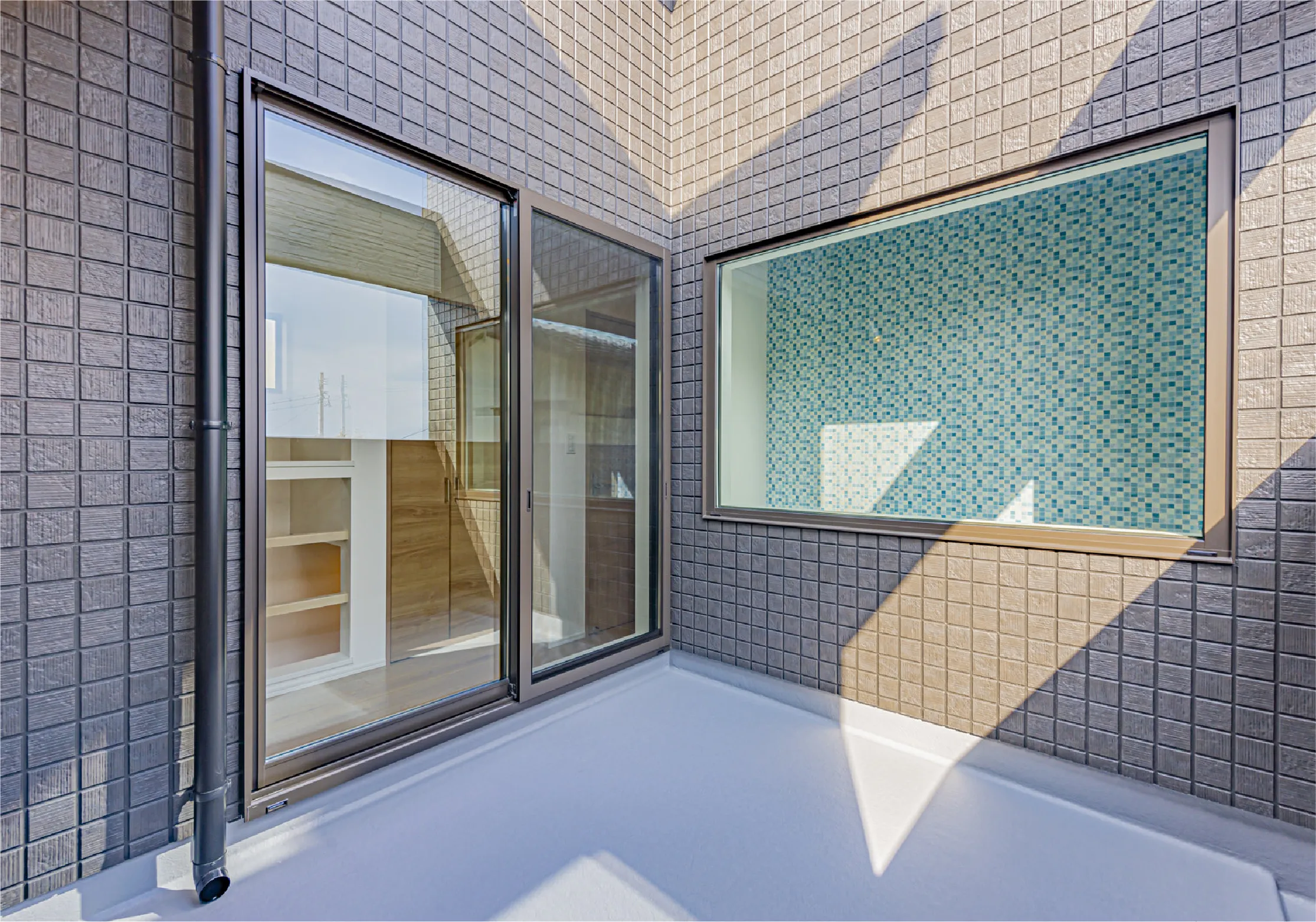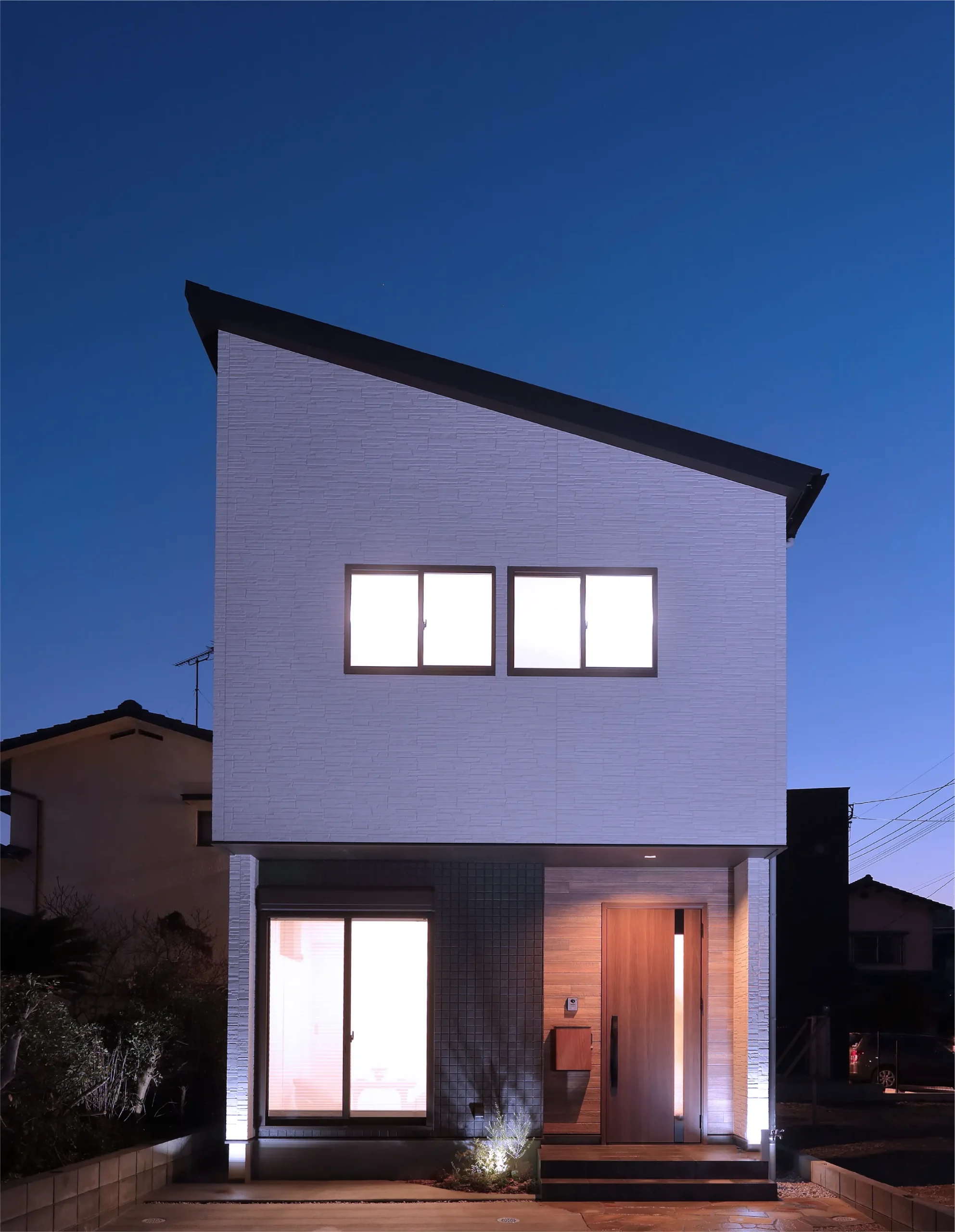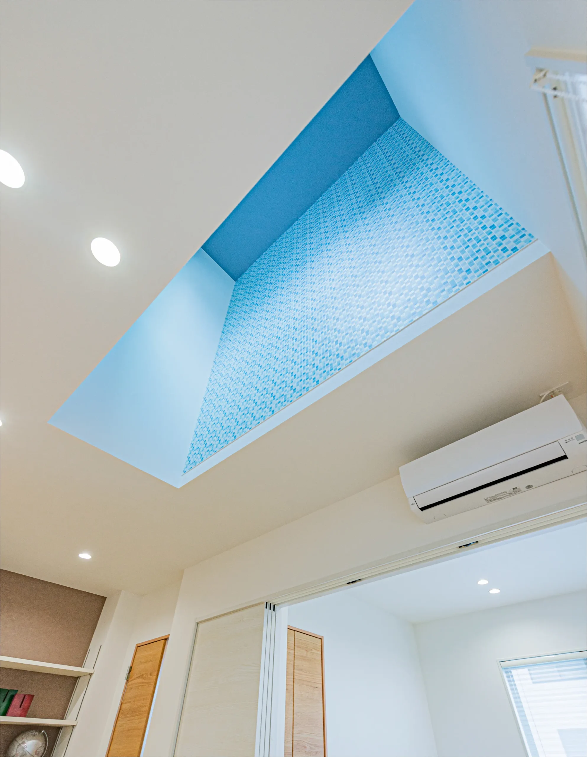 水面をイメージした吹抜けは、日中は窓から光が差し込み印象的な陰影をつくり、夜はリビングから漏れる灯りが2階のルーフバルコニーとホールを照らし出し、セカンドリビングとして寛ぎの場を演出する。