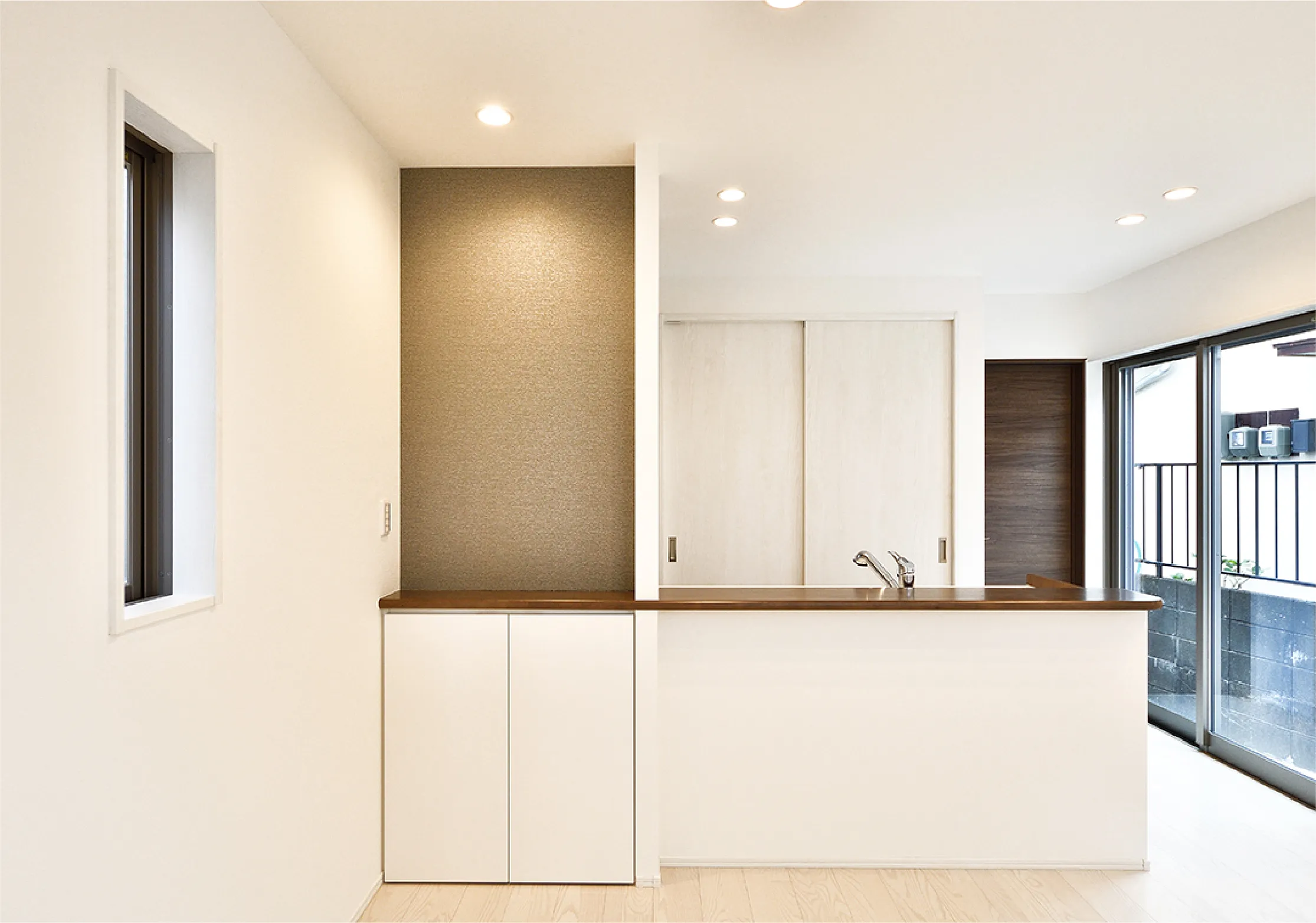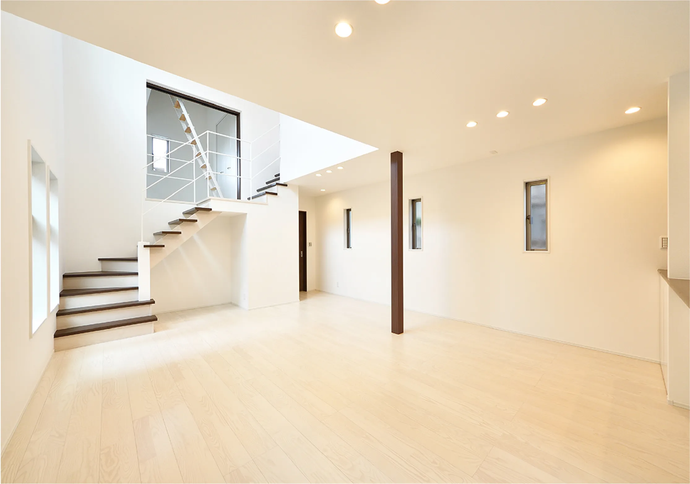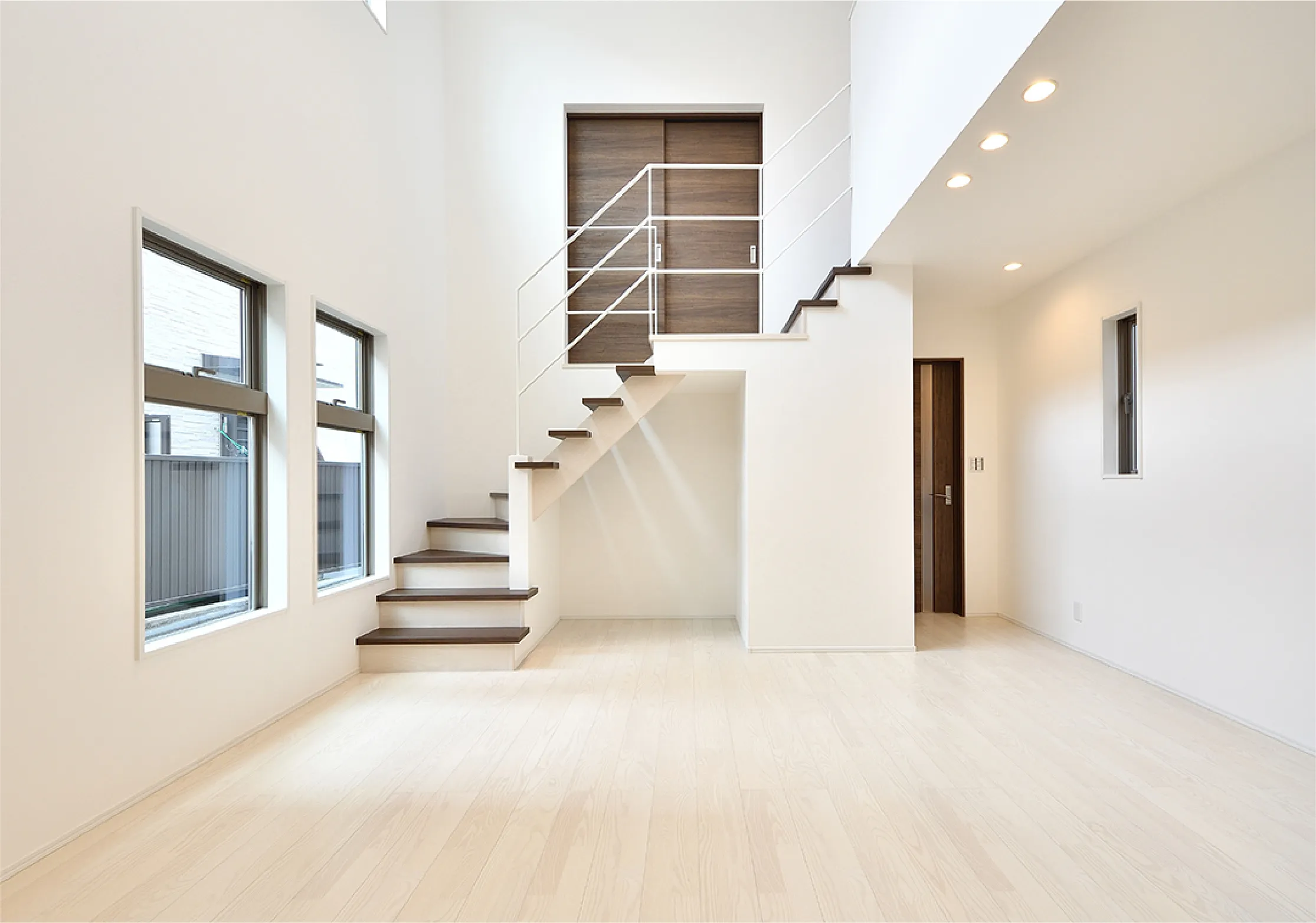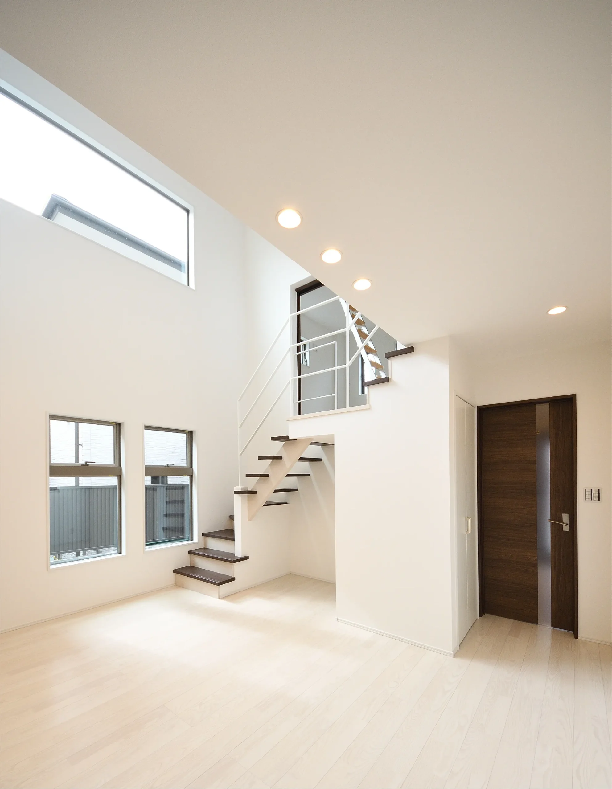 スキップフロアとLDKの上部の吹抜けは空間を縦に開くことで、より広く感じられる住空間と採光部から降り注ぐ光と風が心地よい空間を創りだす。