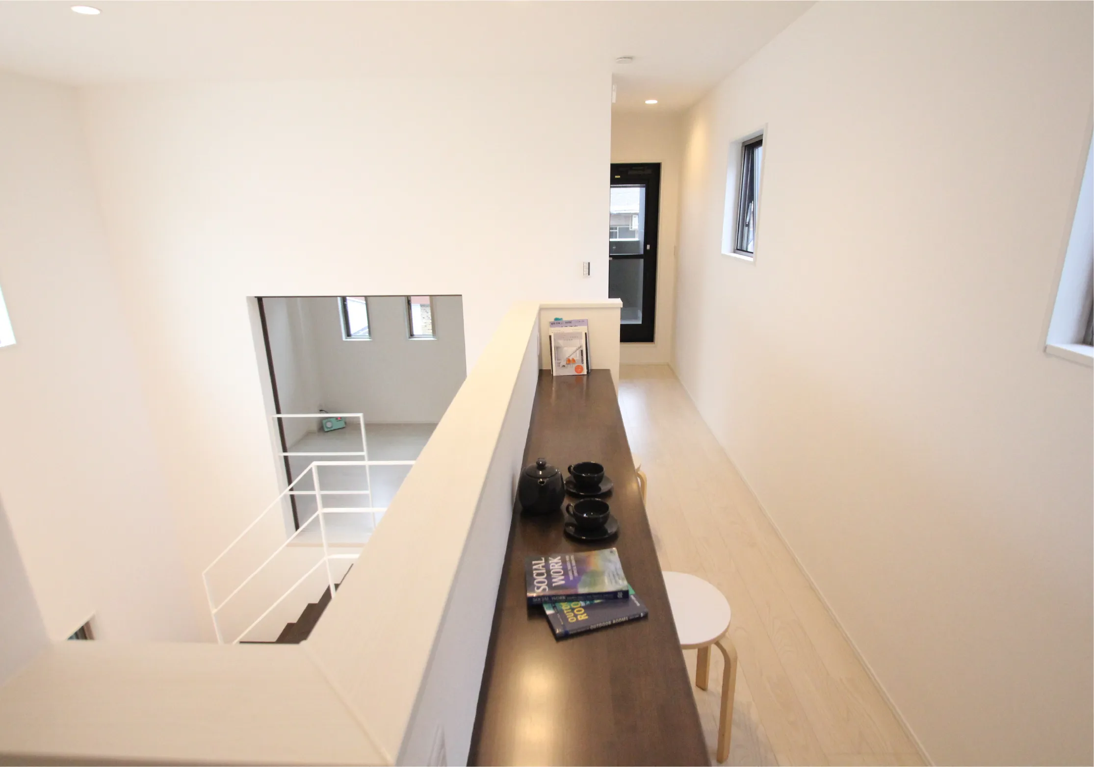 2階にはプライベート空間を確保しつつ吹抜けを囲う様にワークスペースがあり、どこにいても家族のつながりと光を感じられるように設計。