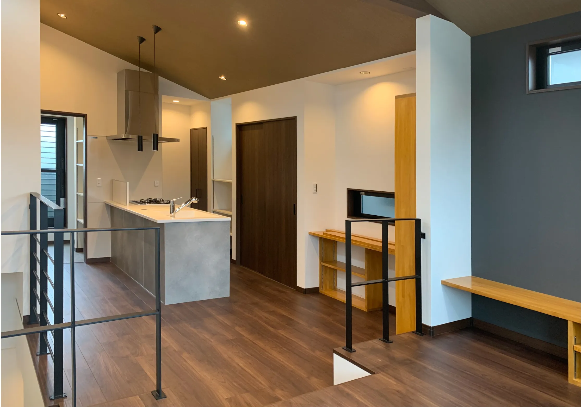 敷地面積82.46㎡の狭小地に建つ延床面積76.59㎡のカフェライクな2階リビングの注文住宅。17帖の2階リビングは天井高最大約3.4mの勾配天井が空間に広がりを生み、アイアン素材と木材を併せた内装デザインが居心地の良い空間を演出。