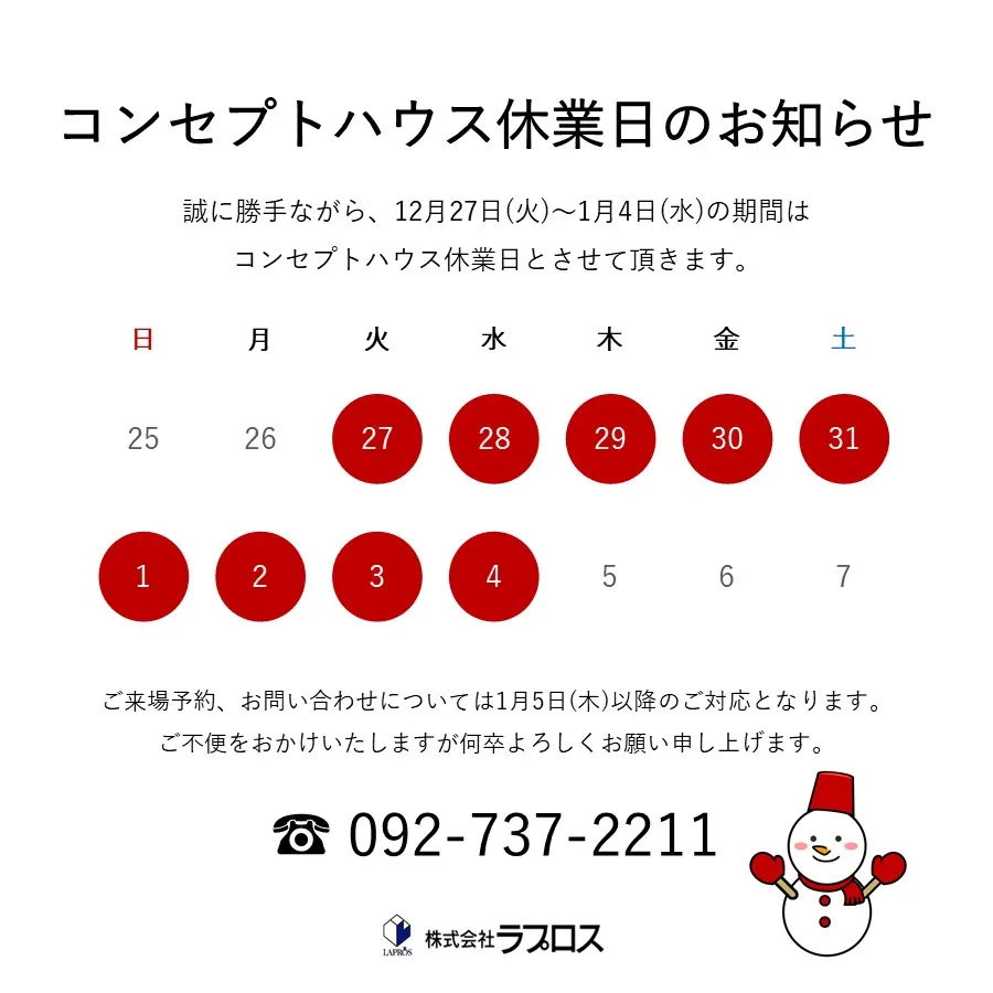 誠に勝手ながら、12月27日(火)~1月4日(水)の期間は